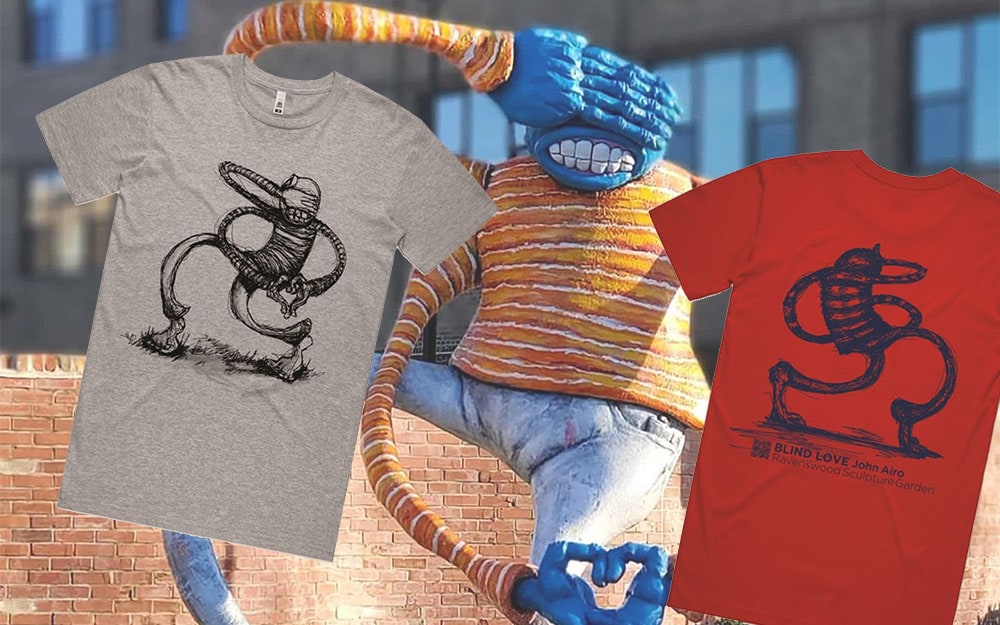 Show your love for “Blind Love” with a limited edition t-shirt designed by artist John Airo! These comfy, colorful tees feature his concept art for Ravenswood’s “Blind Love” sculpture on front and back. 100% of proceeds support public art programming…