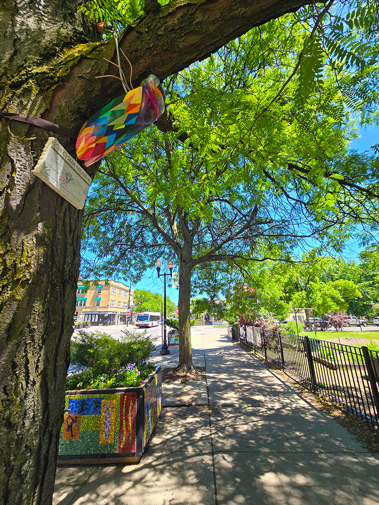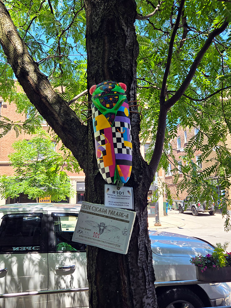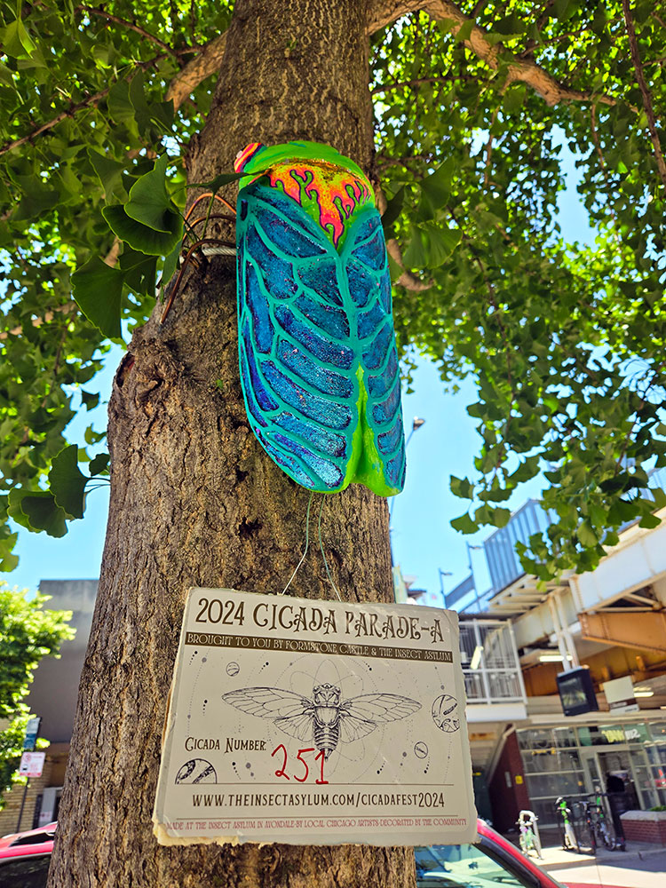 This temporary, “once every 221 year exhibition” will be on display throughout the summer. Each 18-inch sculpture was hand cast in Avondale and decorated by local artists. Crews from The Insect Asylum began installing the cicadas around the neighborhood in late May. Now, we invite you to explore the Cicada Parade-a Ravenswood Route! You’ll find our cicadas installed along Wilson, Ravenswood Ave, Montrose, Clark, Lawrence, and Damen. See our handy map to plan your tour!