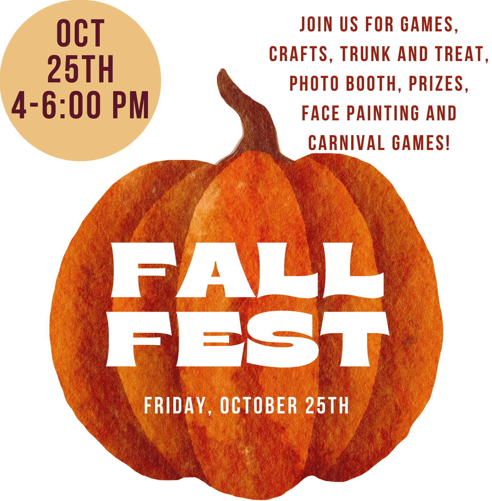 Fall Fest will feature live music from John Glew String Studio and Jonas Friddle. Festivities will include crafts, games, prizes, food trucks, a pumpkin patch, photo booth, costume parade, and more!