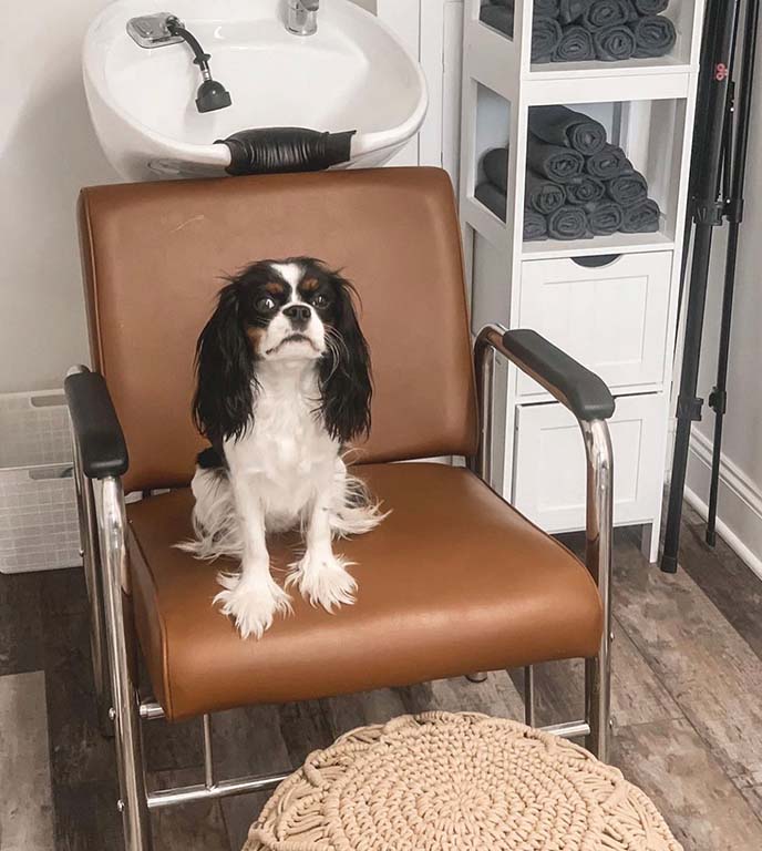HG Studio’s staff includes myself and a very lazy but cute assistant, Jill. Jill is a one year old tri-colored Cavalier King Charles Spaniel that loves to keep clients company while they’re getting services. She is also the inspiration for the salon’s color scheme.