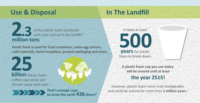 Styrene, the main ingredient in polystyrene foam, is classified as a likely carcinogen in humans. Polystyrene does not biodegrade and may persist in the environment for more than one million. As styrene leaches from landfills into our drinking water, it can cause liver, kidney, and circulatory problems. For more information about the negative impacts of polystyrene, check out this Fact Sheet from Beyond Plastics.