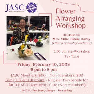 Let your creativity bloom by creating your own Valentine flower arrangement with instructor Mrs. Yuko Inoue Darcy of the Ohara School of Ikebana. Take home your beautiful arrangement after the workshop. Come early at 5:30 pm for a pre-workshop social tea time before we get started at 6 pm.