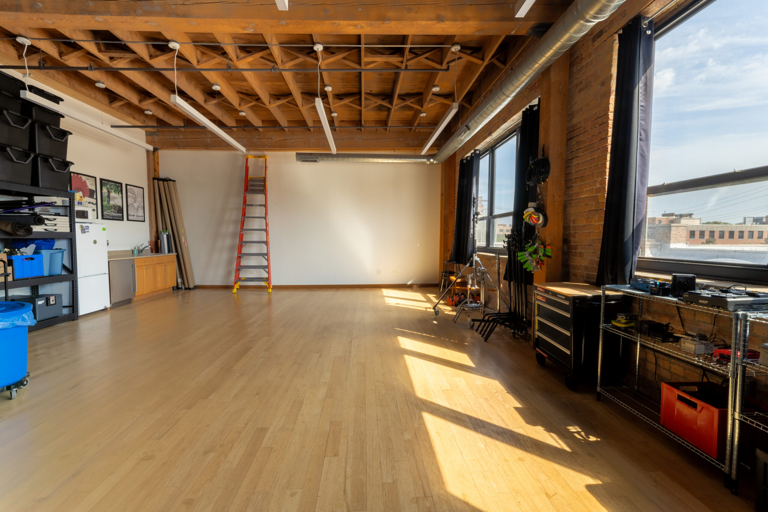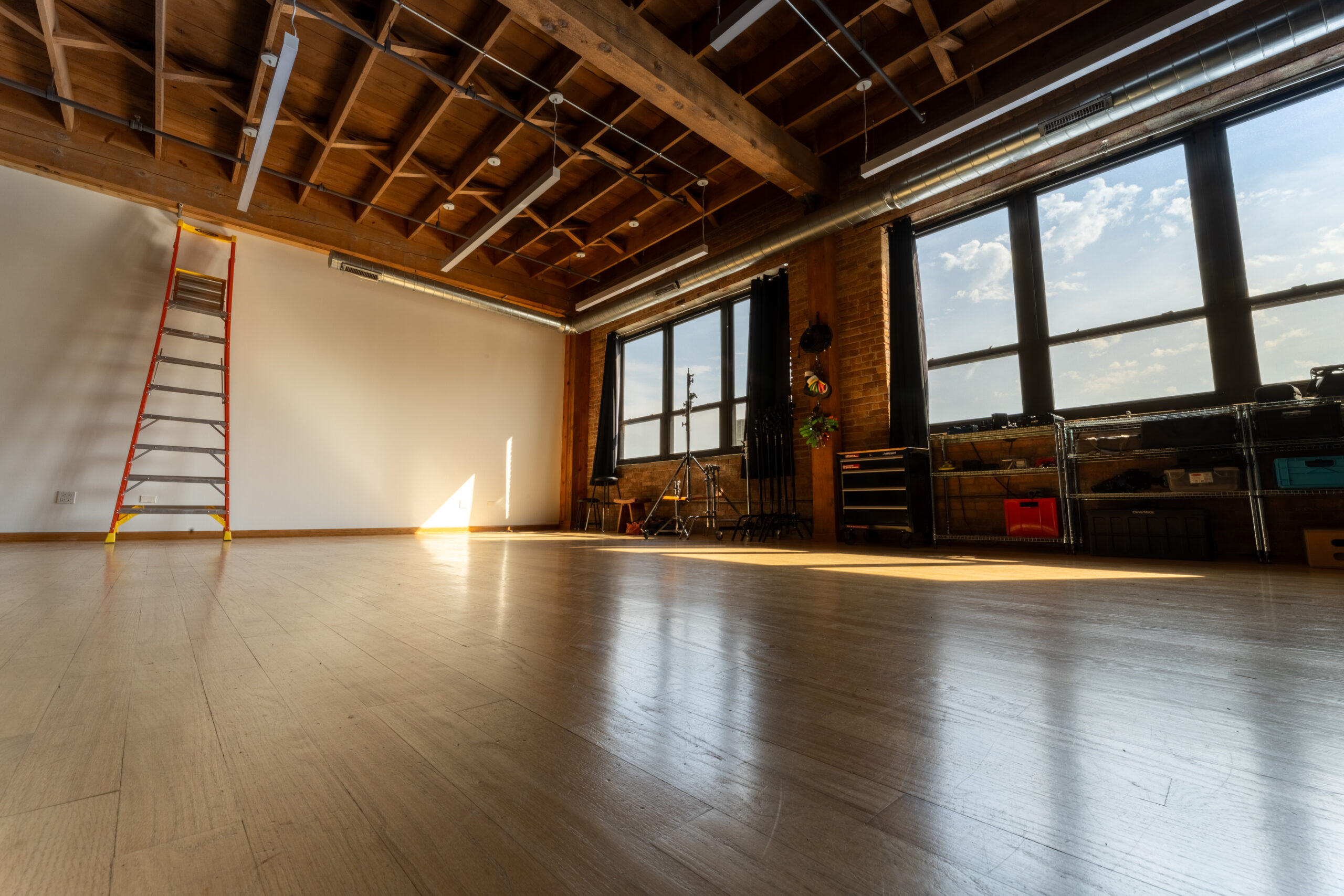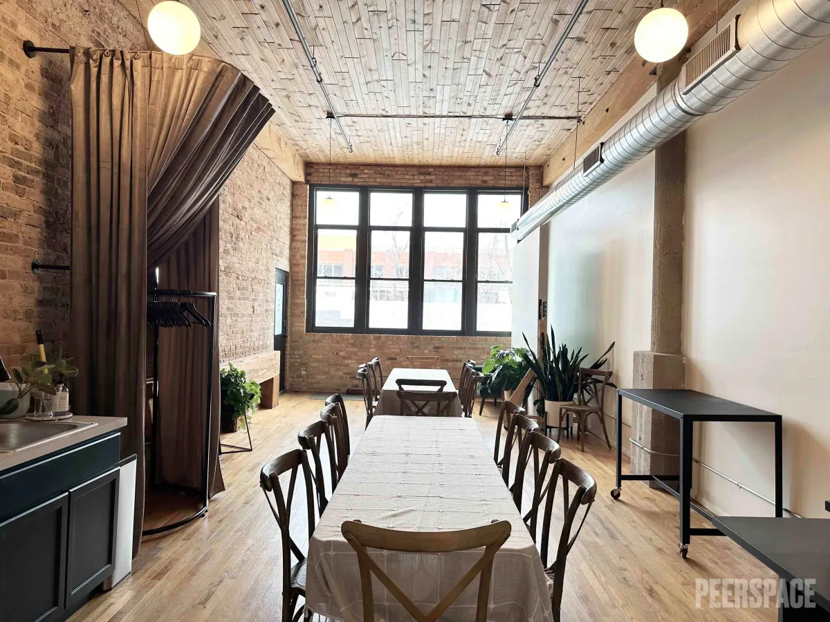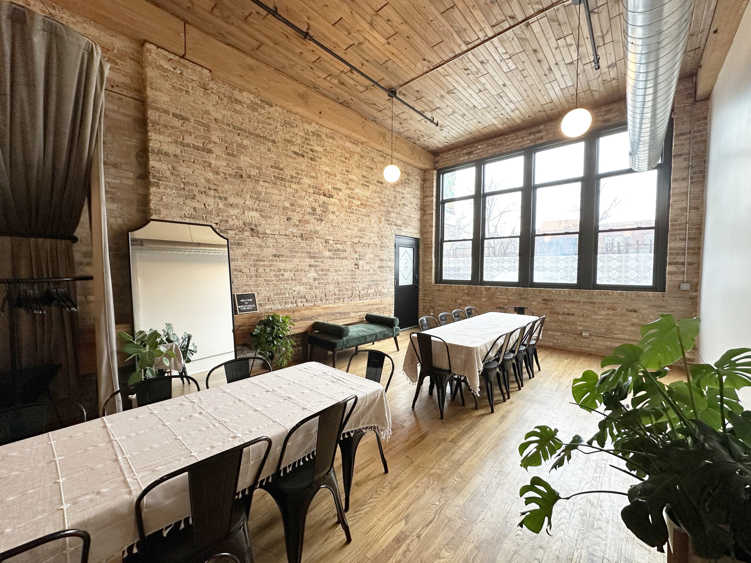 An exposed brick loft studio with soaring 14-ft ceilings available for intimate gatherings, workshops, brunch, dinner parties, bridal or baby showers, and birthday parties. Tall west-facing windows allow ample natural light, beautiful during golden hour. This unit has ground-level door entrance to the street for easy entry and unloading!