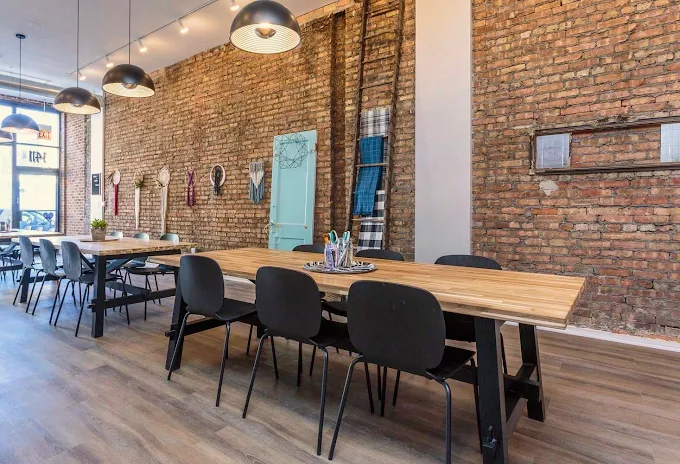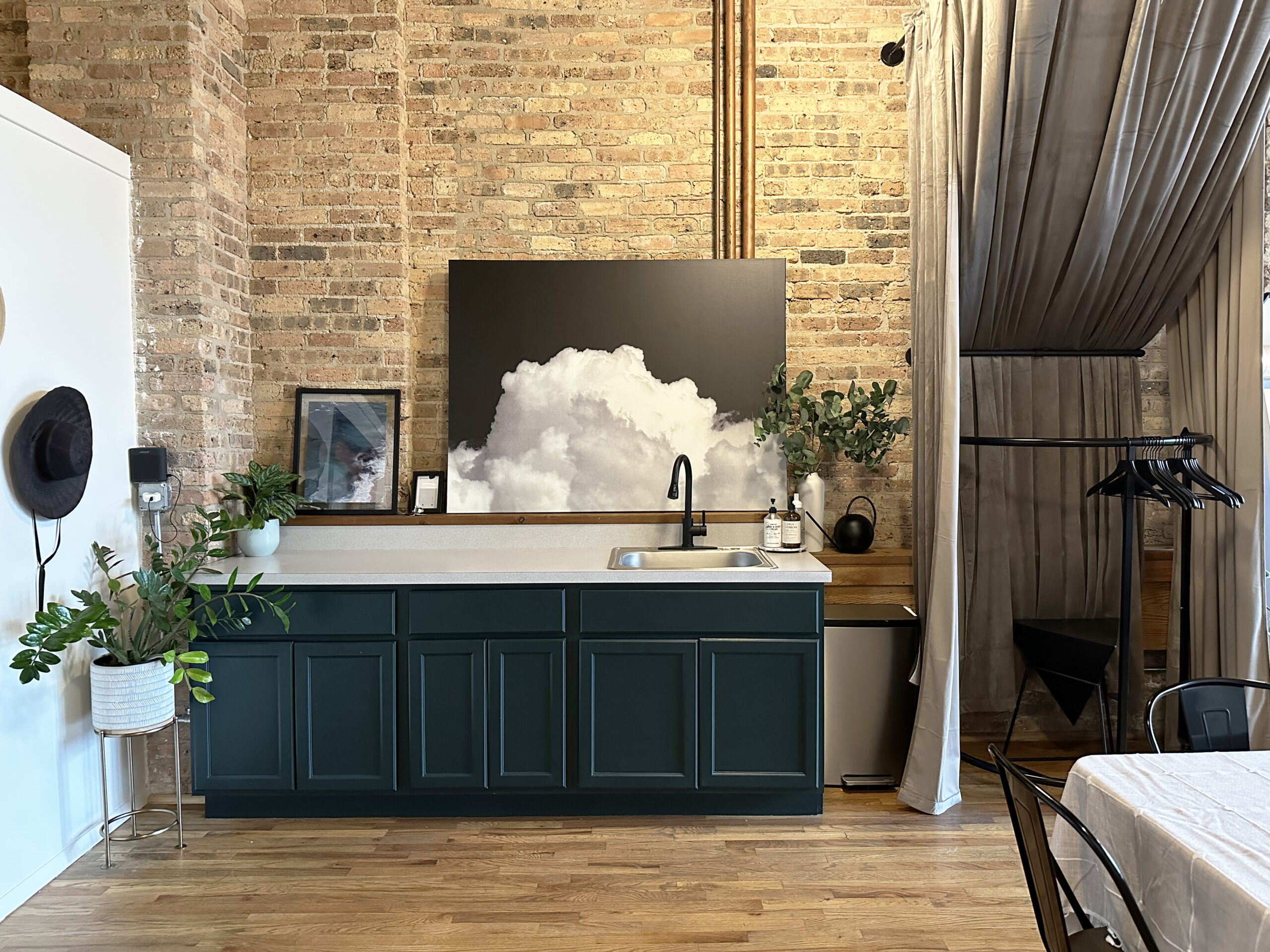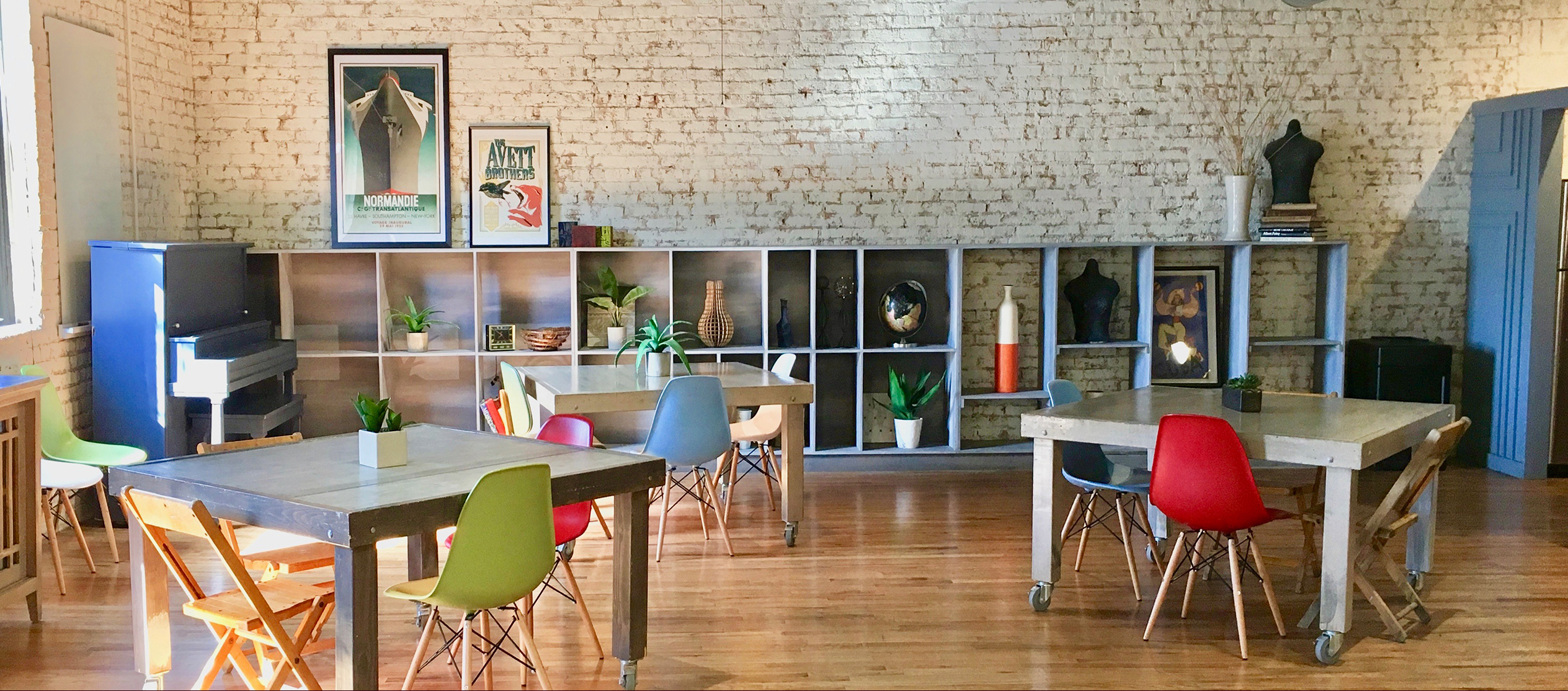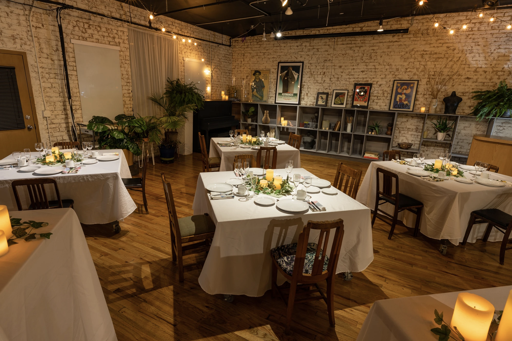 An exposed brick loft studio with soaring 14-ft ceilings available for intimate gatherings, workshops, brunch, dinner parties, bridal or baby showers, and birthday parties. Tall west-facing windows allow ample natural light, beautiful during golden hour. This unit has ground-level door entrance to the street for easy entry and unloading!