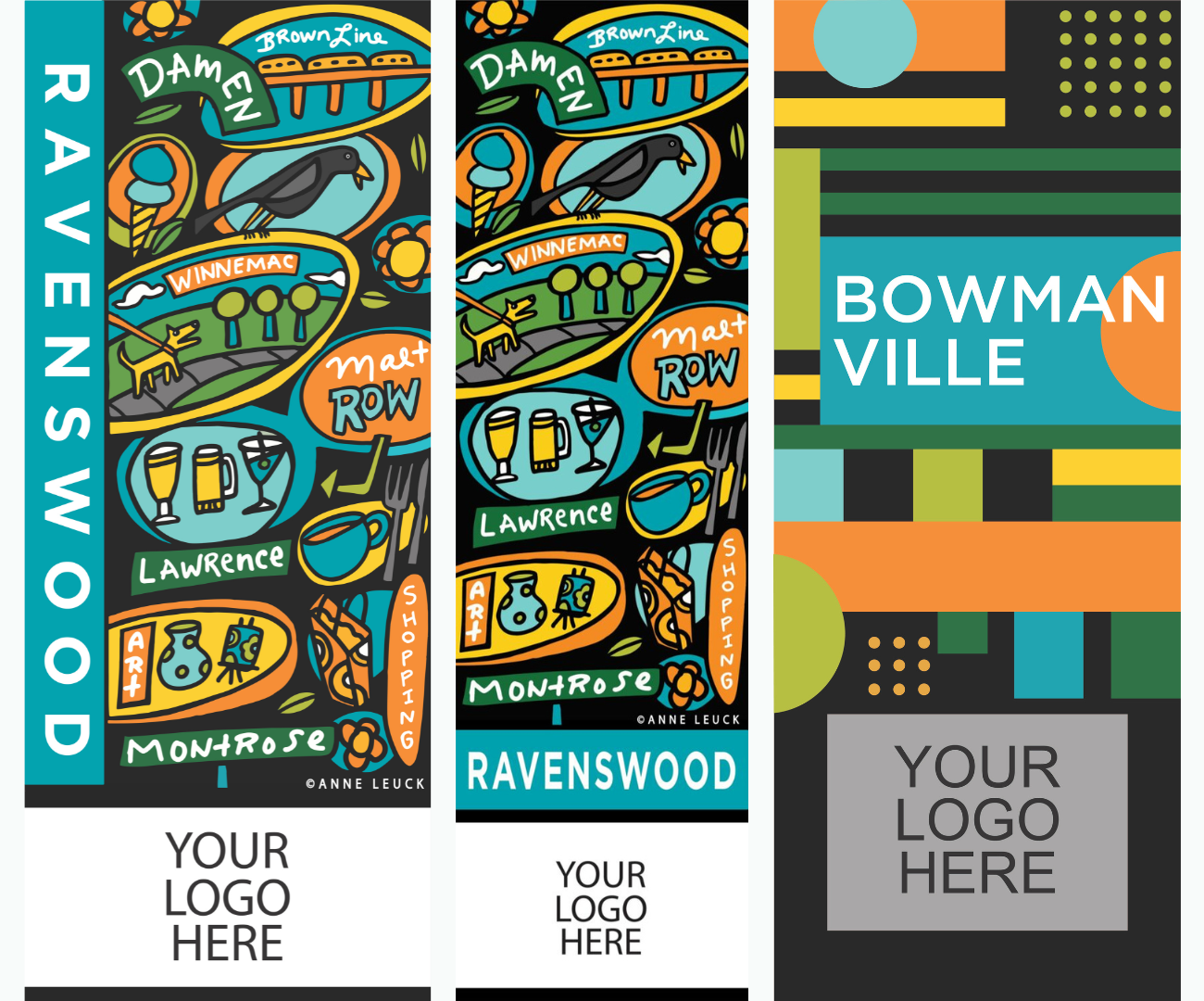 All of the Ravenswood Banners feature an original design by Anne Leuck Studio, representing the diverse offerings of our neighborhood corridors. For Bowmanville, all of the banners feature another unique design.