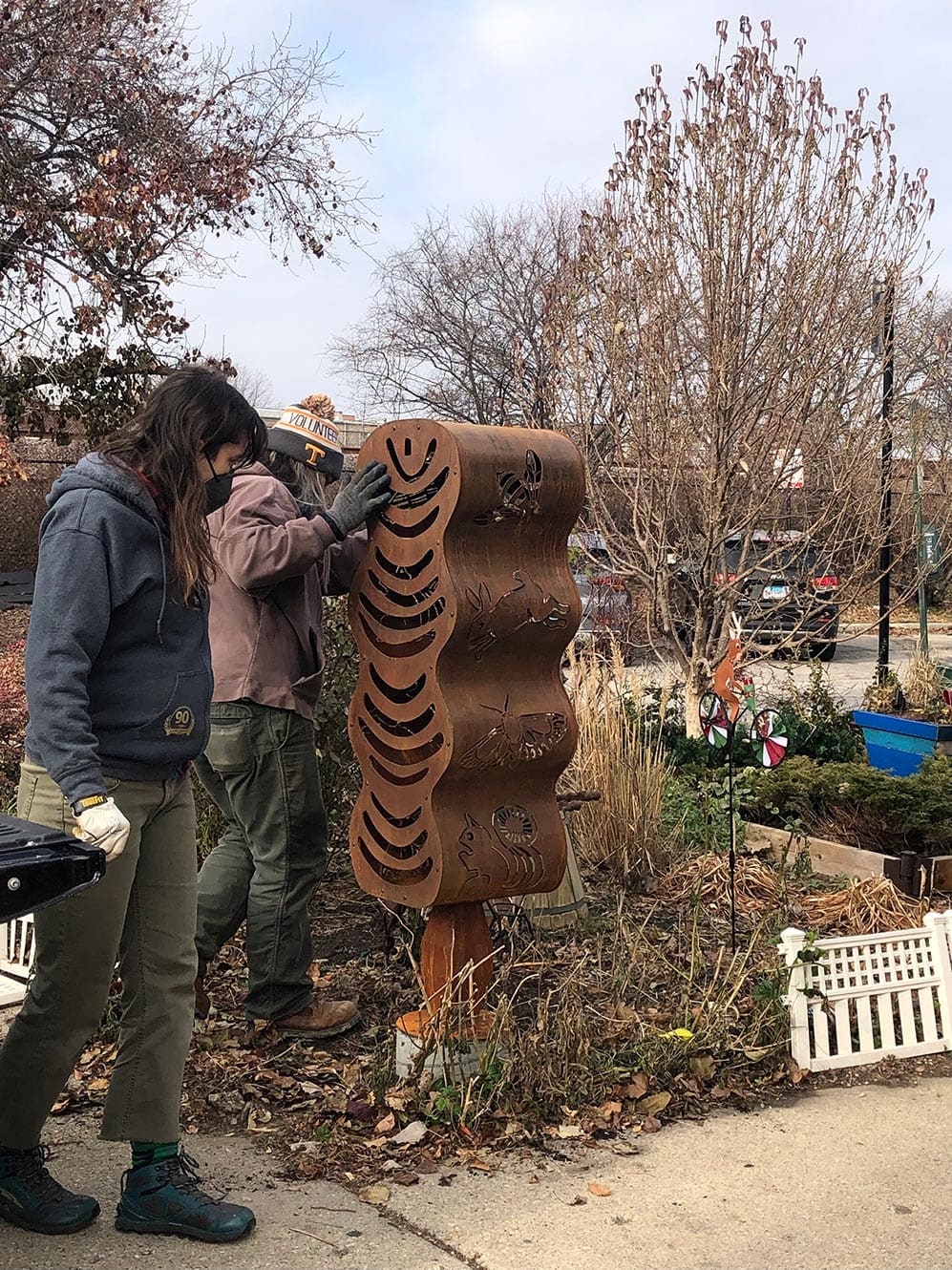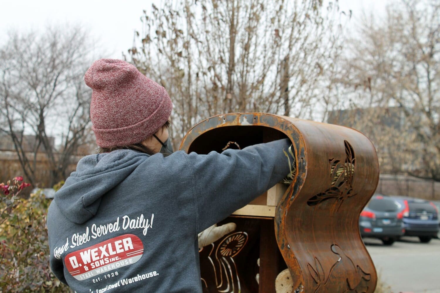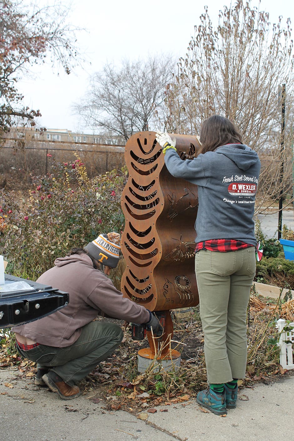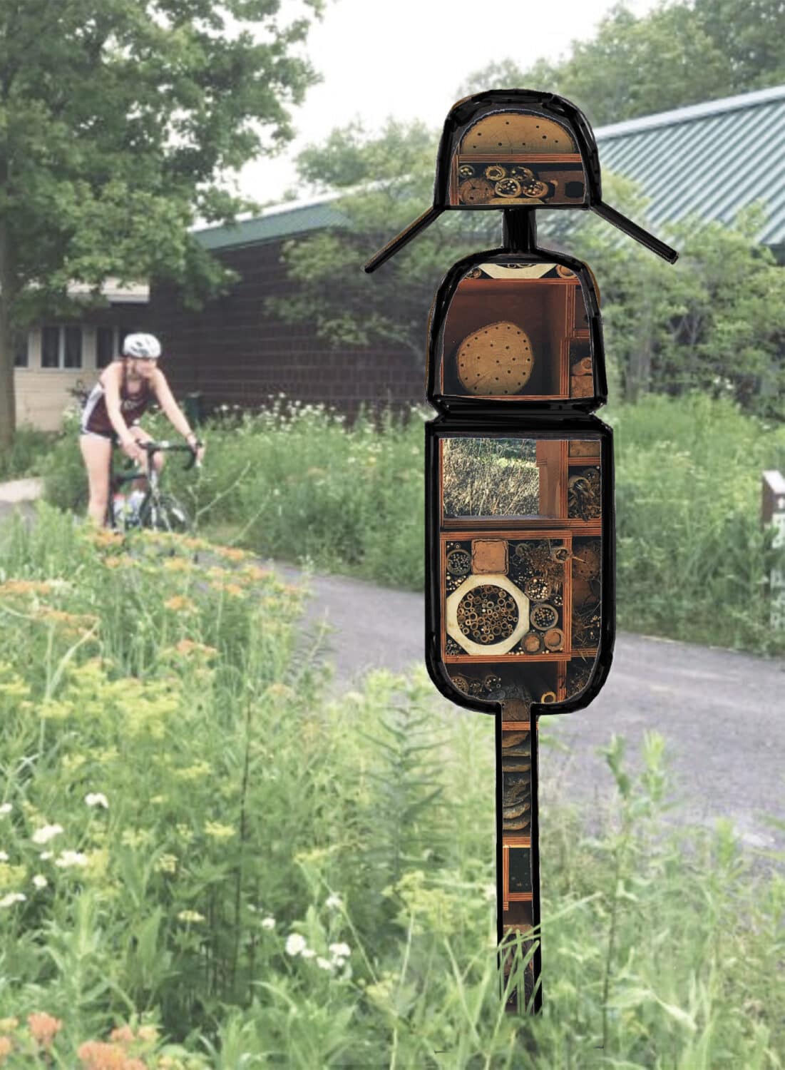 The piece functions as a pollinator habitat and public artwork, joining art and science. The sculpture is designed to meet the optimal dwelling needs of indigenous pollinators, solitary bees, and other insects.