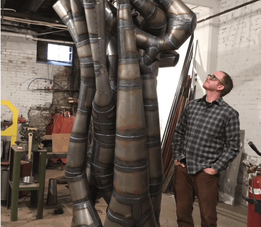 Tubular structures resonate with me because they visually create and conceal space. I gravitate toward them as formal touchstones because there is an engaging ambiguity in the incrementally configuring structures and implied growth that they allow for. Mine is a fluid, invertebrate, baroque sculpture.