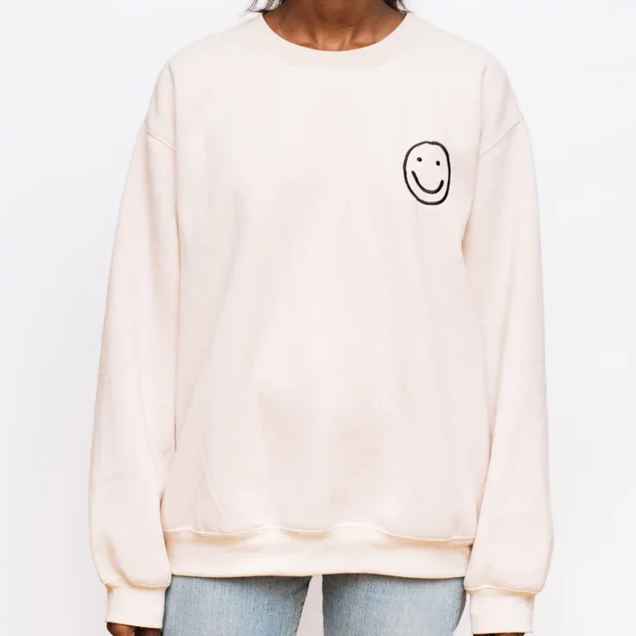 Give the gift of good vibes for the holidays! The Happy Crew Neck Sweater by The Things Between features an embroidered smiley on a cozy, light colored sweater. Founded by Jessica Kim, The Things Between creates “goodies that are made to always find the good in the things between.”