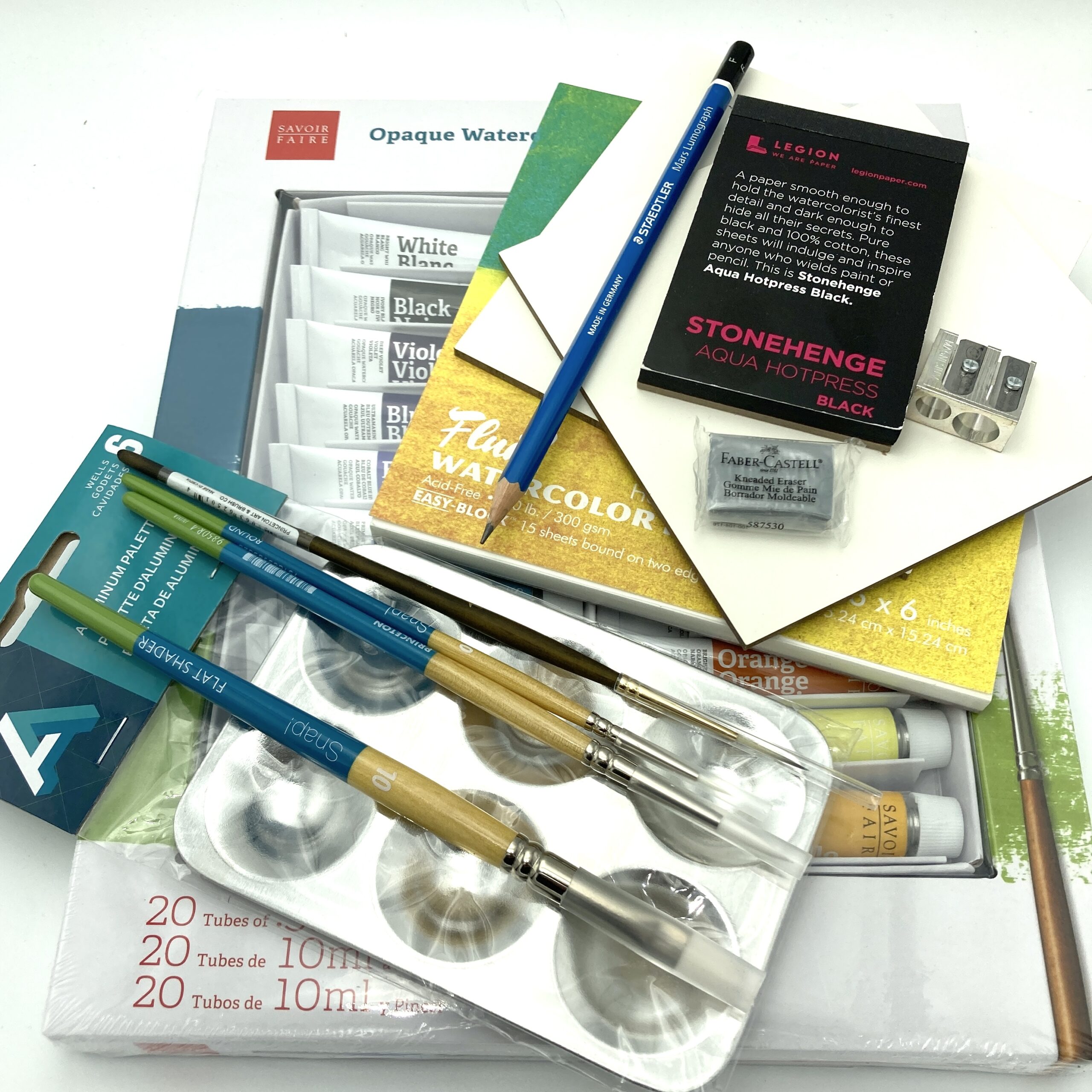 The Gouache Kit has everything you need to get started with the medium from various substrates to try, to several sizes and types of paintbrushes, 20 colors of gouache paint, a palette, and so much more! All kits come packaged in a reusable gift box with crinkle cut paper inside.