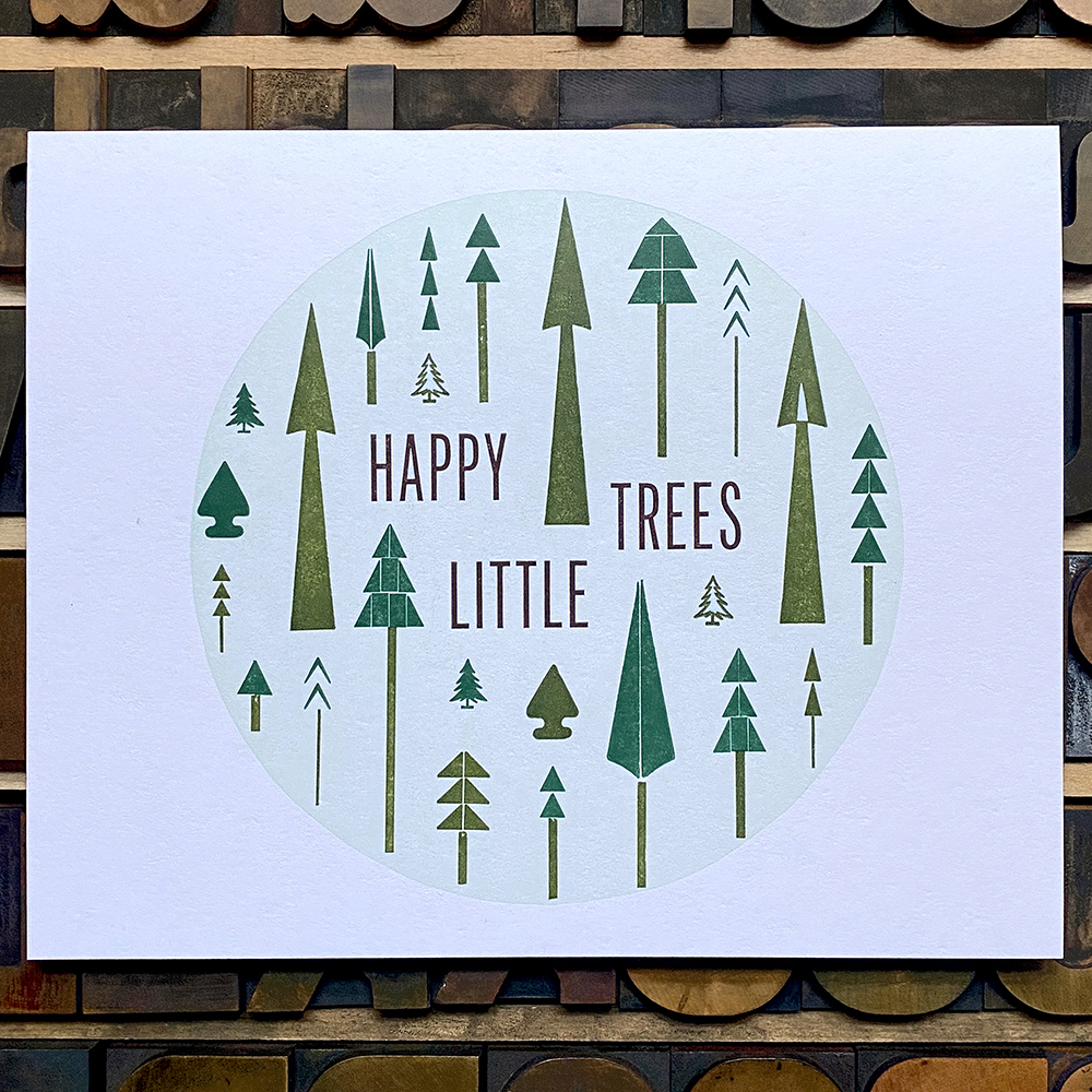 Give the gift of happy little trees! This jolly print is constructed from metal and wood type in a circular shape, accented by a round linoleum cut. Printed in a few different earthy greens and browns.