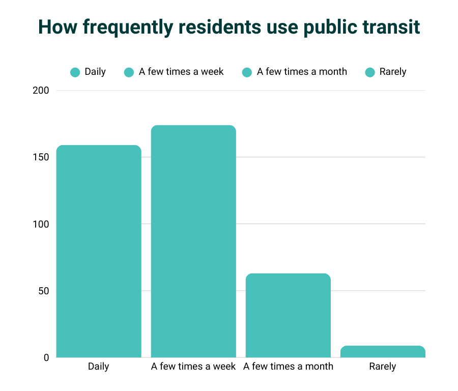 - Residents are reliant on public transit. Over 90% reported they could not live comfortably in Chicago without reliable service. Many stated that they don’t own cars by choice or necessity. Respondents rely on transit for commuting to work, medical appointments, grocery shopping, visiting loved ones, accessing resources, and recreational activities.