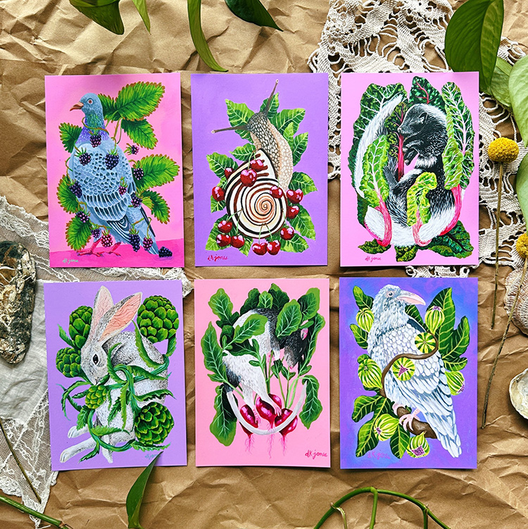 Donna’s inspiration comes from the beauty of the natural world. Her favorite subject matters include delicate florals, odd creatures, ocean inhabitants, and insects. The mediums she uses are acrylic, watercolor, and gouache.