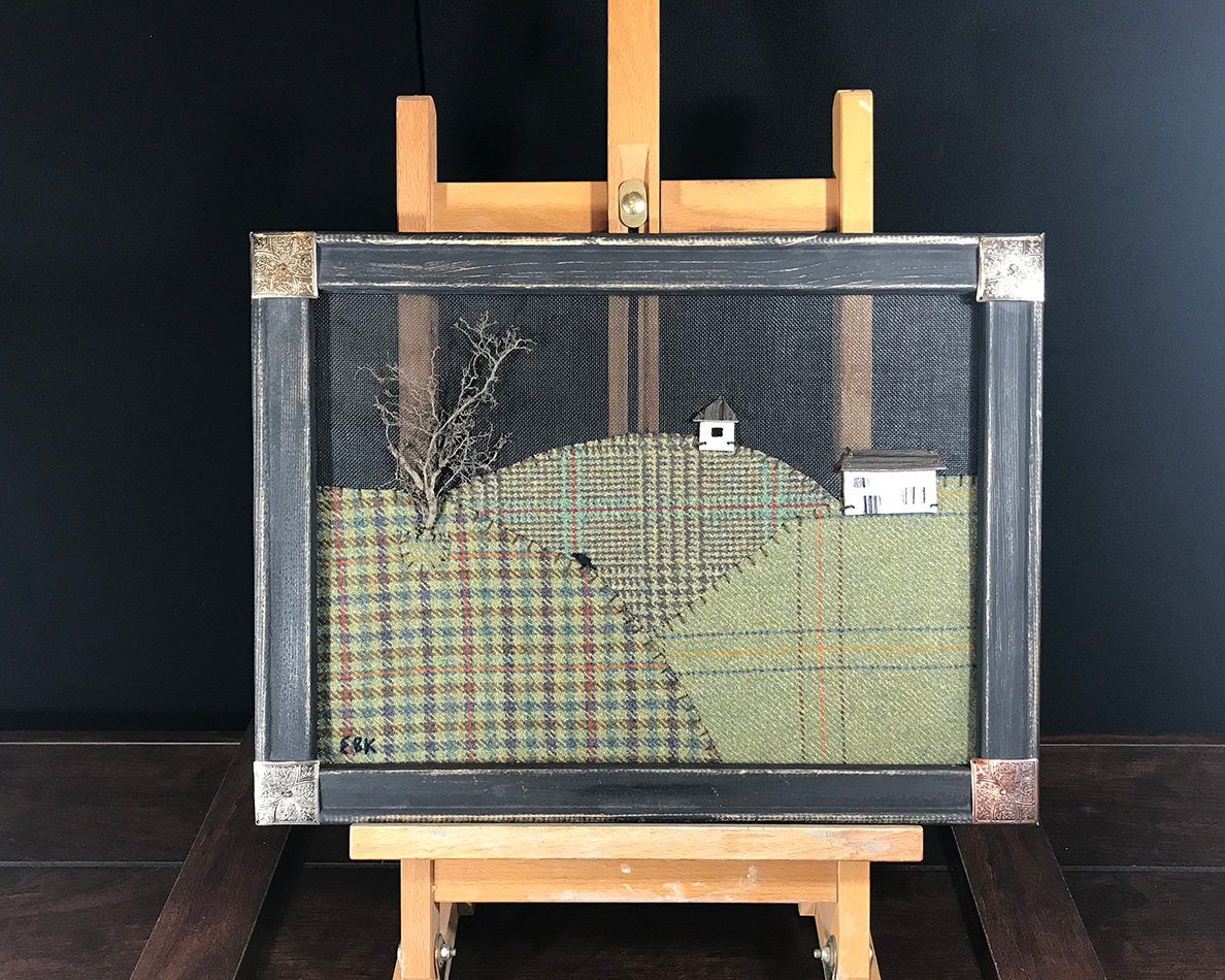 I see the beauty and possibilities in things that most people would overlook or even discard. This is a central motivation behind what I do – to take something that is considered “less than” and give it a chance to shine. I love turning repurposed clothes, discontinued designer remnants, vintage things, found objects and organic bits into one of a kind artworks. Everything is hand drawn, hand cut, hand sewn, hand painted and my roots are hand picked from the woods behind our house. Each piece tells me what it wants to be; each material and component whispers how it wants to evolve. As I take my turn at “women’s work” and weave my emotions, hopes and dreams into art, I contemplate what my Nana would think. I hope I make her proud.