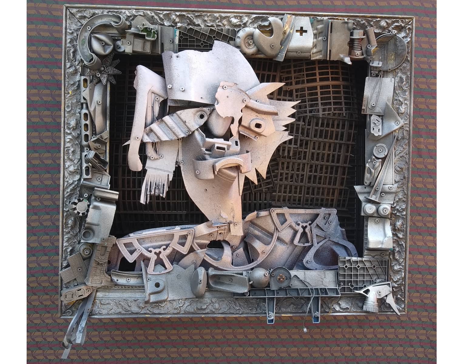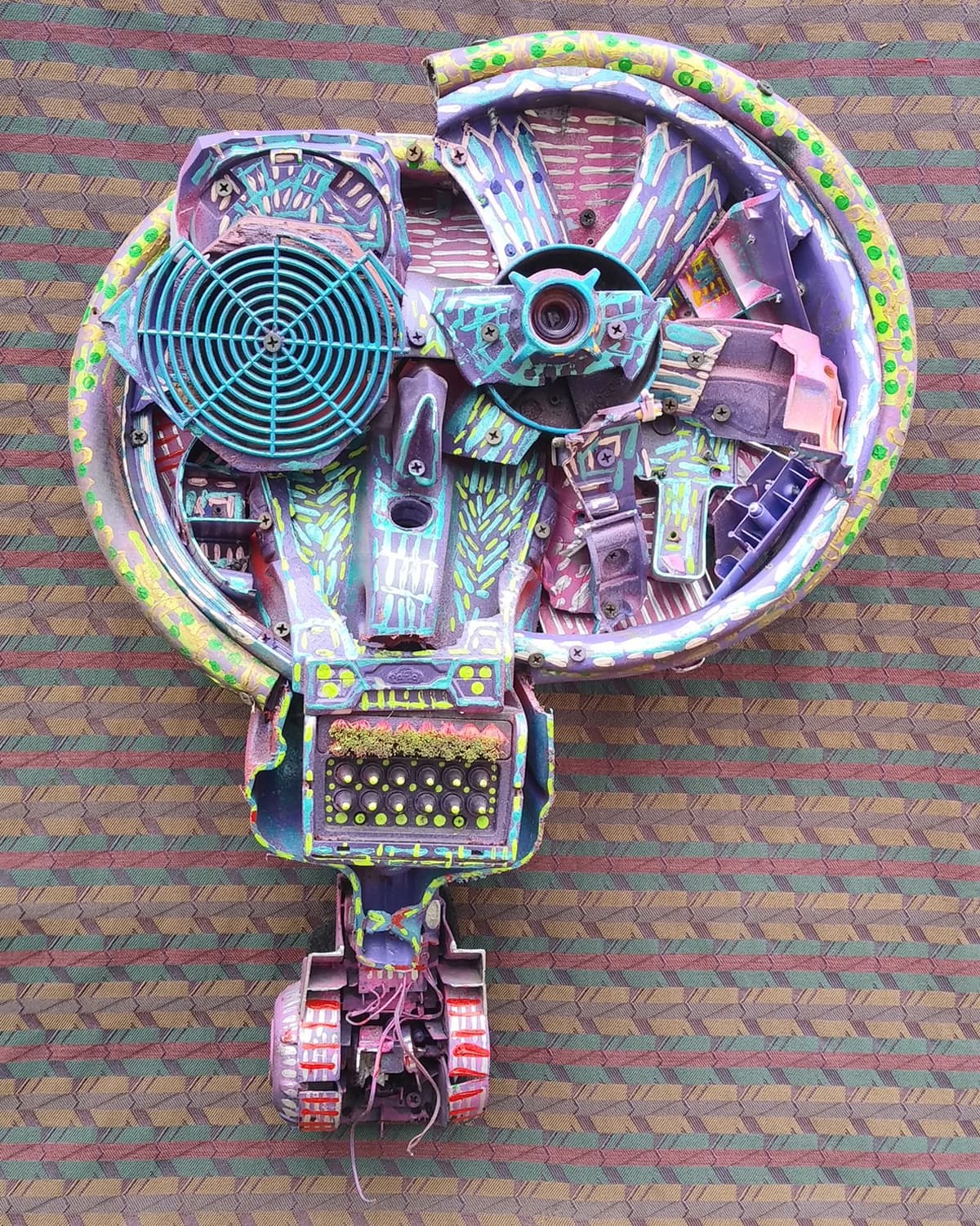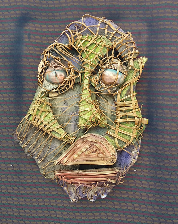 Mathias’ work is made from found object and materials that are incorporated into assemblage faces, figures, mandalas, and abstract constructions. His work is a compulsive effort to repurpose the functionality of found objects and materials to suit his life-long need to make stuff. He hopes to engage the viewer in a conceptual dialogue that changes their assumption about what the work appears to be and what it actually is.