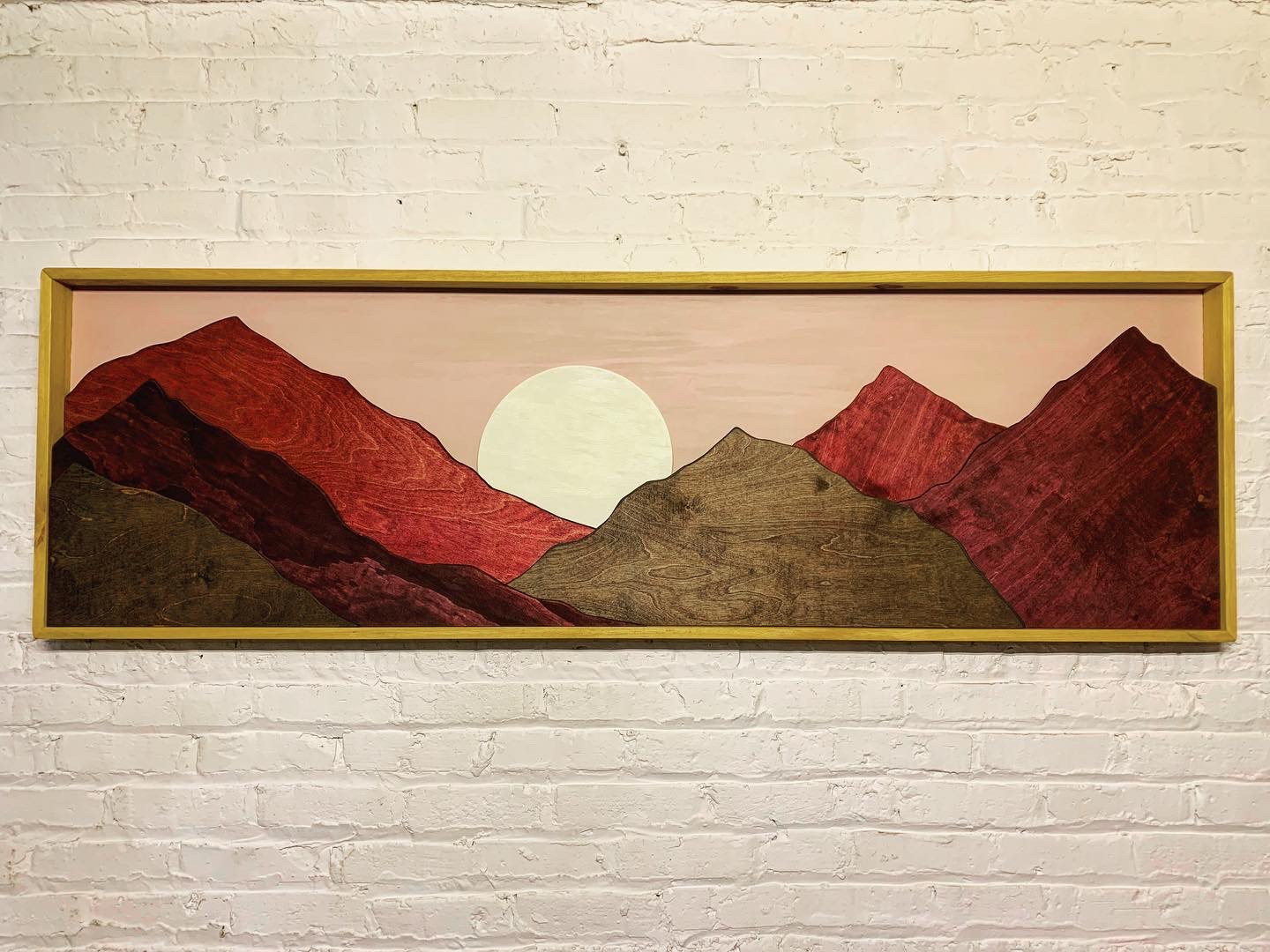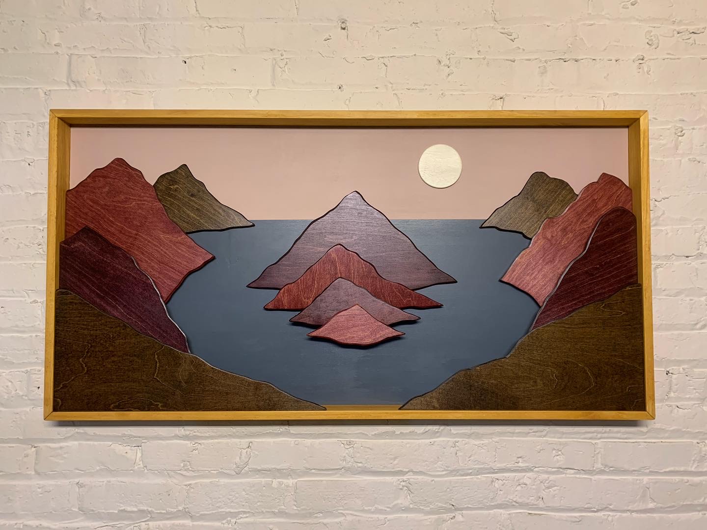 Hello, my name is Gabe Jenkins. I’m an artist in the Ravenswood area of Chicago. I primarily work with wood veneers and plywoods to create shadowbox landscapes. I use new and salvaged materials to produce the pieces, finishing with colorful stains and acrylic paints. I create from my own imagination, as well as others inspirations and photos, giving every room a view!