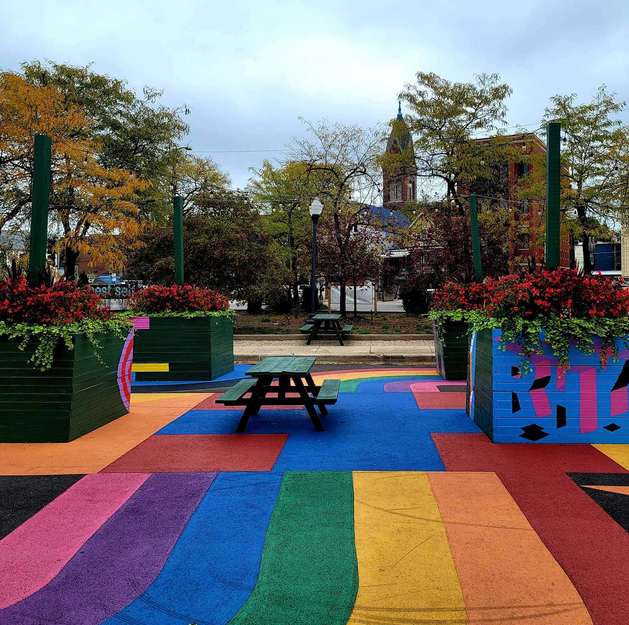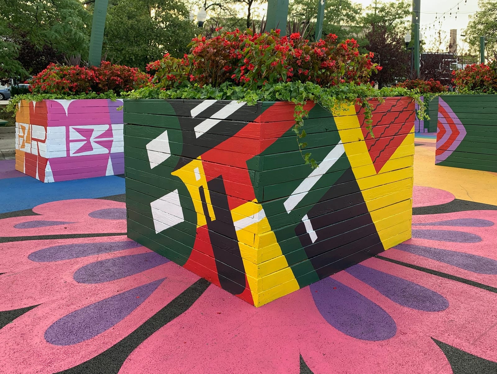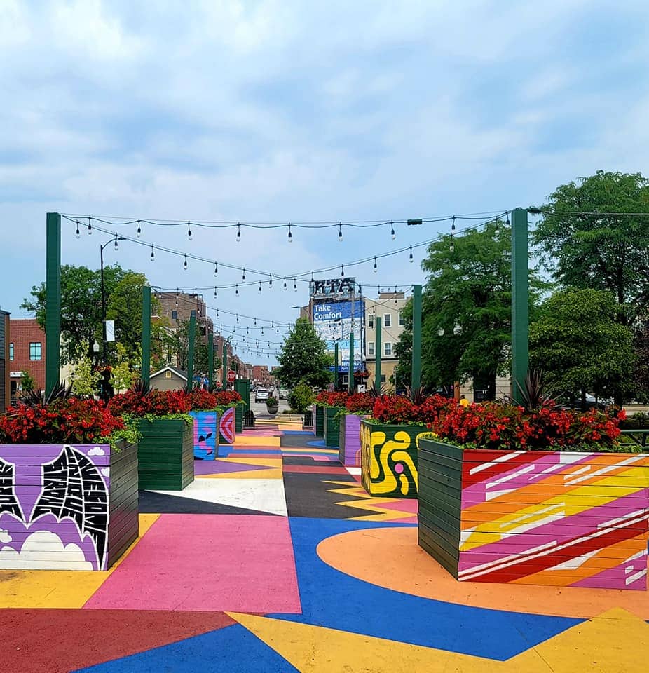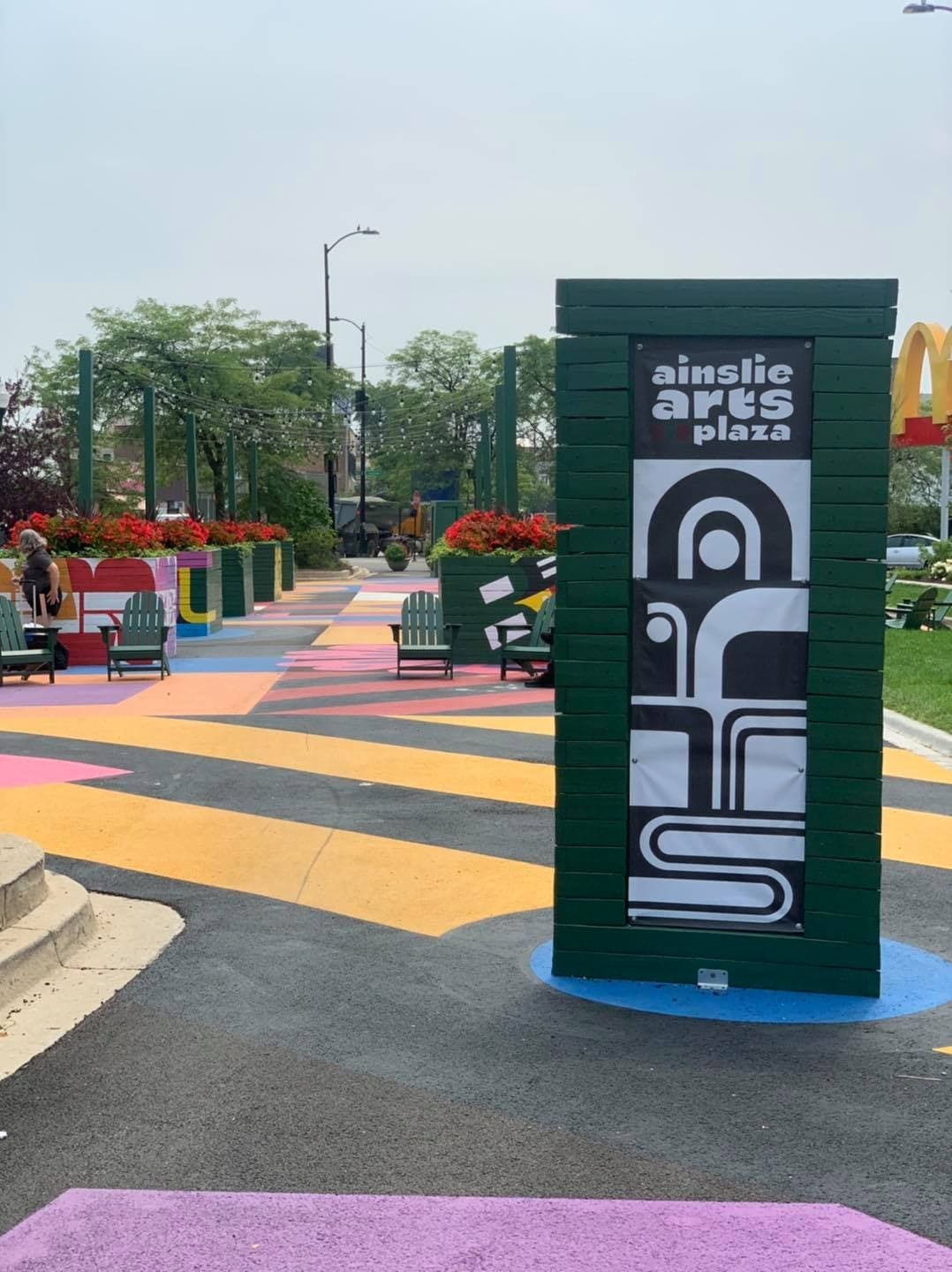 The Ainslie Arts Plaza is a new community space located at 4836 N Lincoln Avenue. Established in 2021, the Plaza features murals by Andrea Jablonski and Judith Meyer, public seating, lights, and landscaping elements. Prior to this transformation, the area was comprised of parking spots and underutilized space in front of the McDonalds on Western Avenue. When an opportunity to reimagine the streetscape presented itself in 2020, 40th Ward Alderman Andre Vasquez shared his vision for a new Arts Plaza. To learn more, visit 40thward.org.