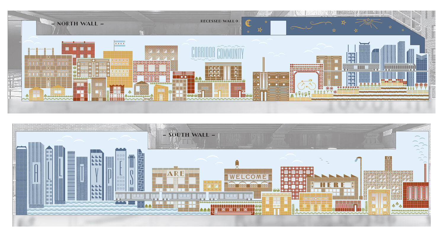 “The history of the Ravenswood Corridor is the story of shared creative space for artisans, trades and residents. My letterpress print shop, Starshaped Press, carries on this tradition, using tools and technology (including type and ornament) that were designed and produced in Chicago, some in the Ravenswood area. These materials are the building blocks of my design, Corridor Community. The text on the south wall, ‘All Types Are Welcome Here’, references both the typographic history of the neighborhood and the people invited to inhabit its spaces now. Trading my usual ink and paper for paint and cement, I’m incorporating the modular, Tetris-like style of letterpress printing to create representations of commercial and residential buildings that populate the area. Both trains that connect Ravenswood to the rest of the city are present, as well as the community gardens that burst with life along the Metra tracks. I hope to creatively showcase the adaptability of the neighborhood’s physical spaces, and how they provide stability for the corridor’s residents.” – Jen Farrell