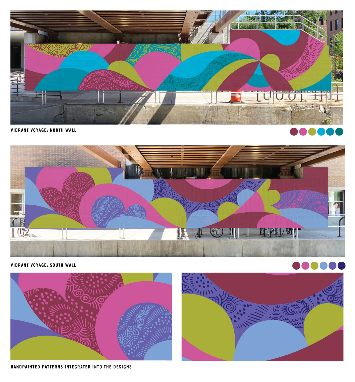 “Humanity has a deep connection to the rhythms and cycles in nature. The Ravenswood Lawrence Viaduct location is bustling with activity, a place that connects people and transportation to community, creativity, and flourishing growth. My design is meant to reflect this dynamic flow. Vibrant Voyage uses expansive, nature inspired forms that overlap and extend beyond, to convey a sense of energetic movement and thriving connectivity through space and time. The vibrant color palettes for each side are different but share partner colors, and work together to evoke feelings of joy, hope and playfulness.” – Molly Z